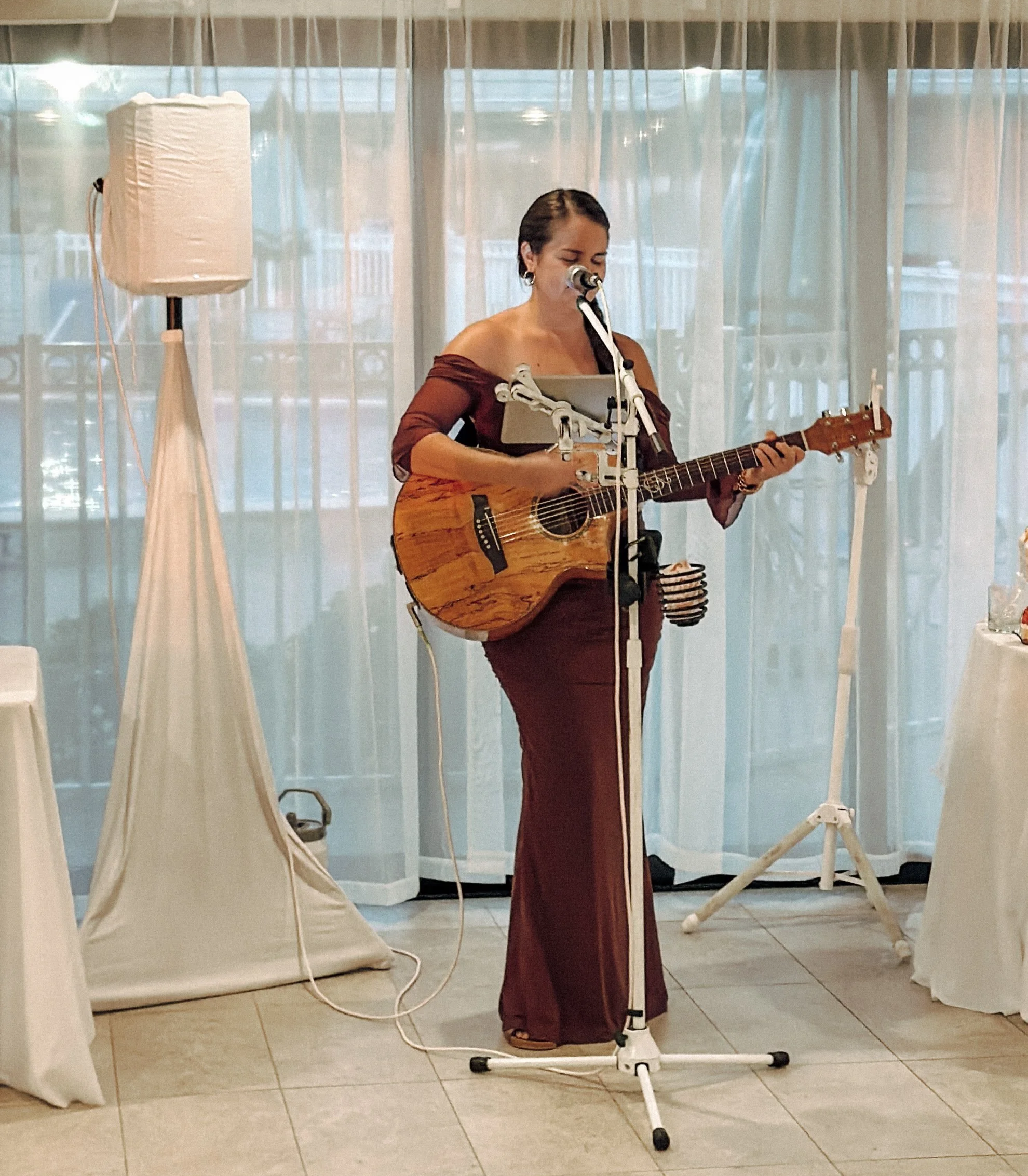 Begin with Mallory performing a 2-hour set featuring vocals and acoustic guitar, offering a simple and engaging musical foundation. This includes guest arrival, ceremony and cocktail hour, or more plainly, a 2 hour performance.